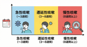 遷延性(せんえんせい)咳嗽(3〜8週未満):感染後の咳などが疑われる移行期間です 。