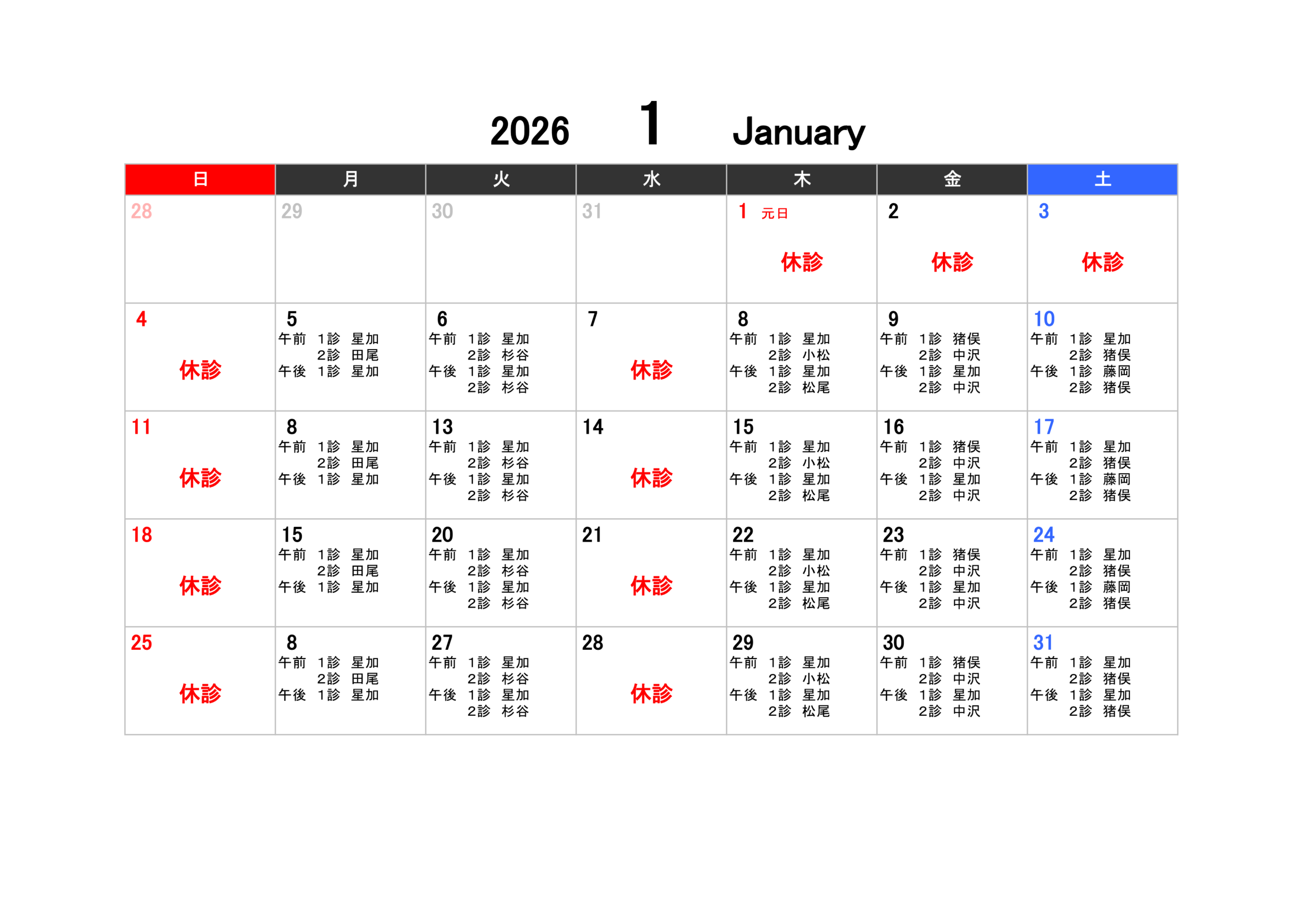 1月の診療予定と担当医表 お知らせ 2025年11月26日2026年01月27日 いつも当院をご利用いただき、ありがとうございます😊 1月の診療予定と担当医表が決まりましたので、お知らせいたします! 12/28~1/4までは冬期休暇となります☃️❄️ ご迷惑をおかけいたします🙇 来年もよろしくお願い致します☺