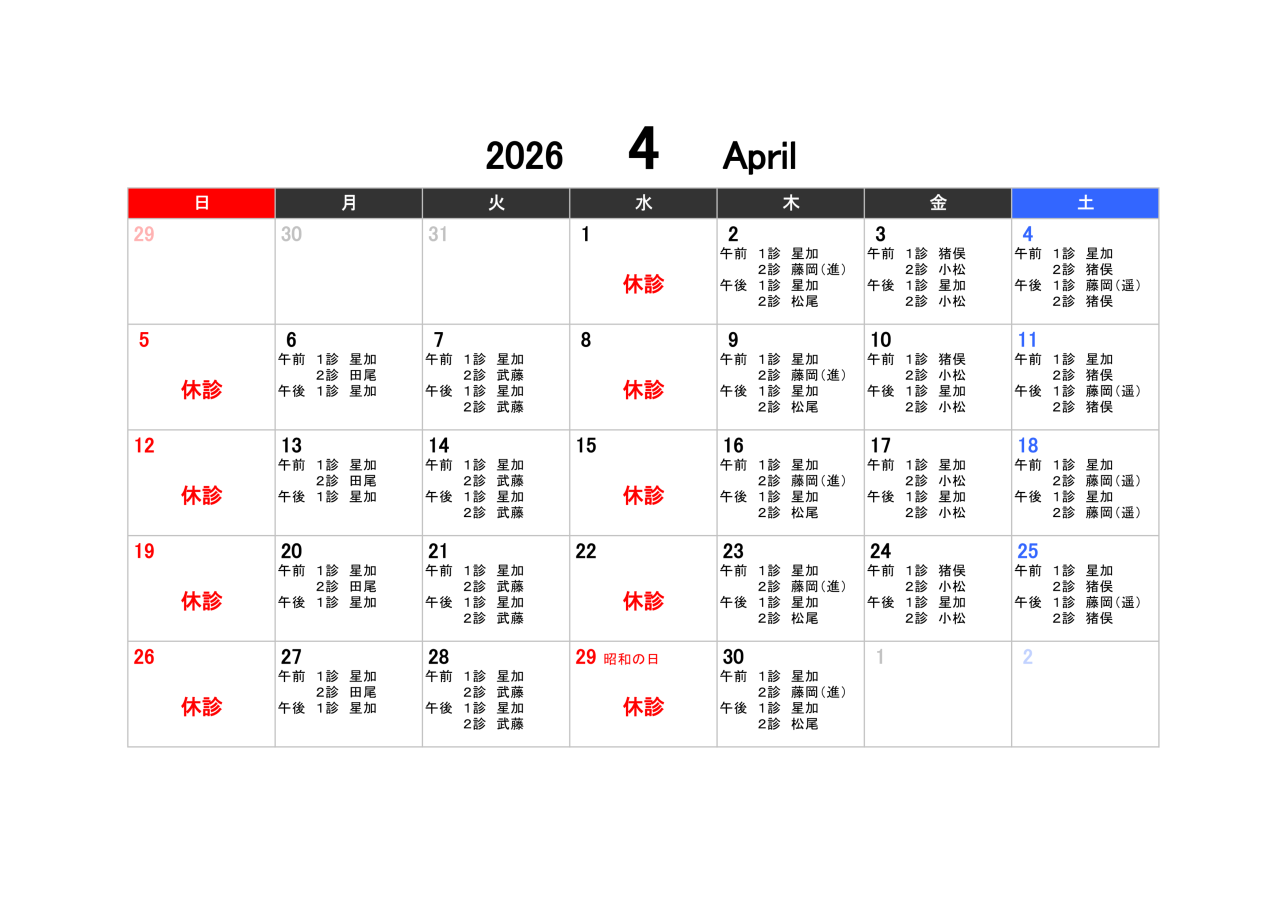 4月の診療予定と担当医表が決まりましたので、お知らせいたします!